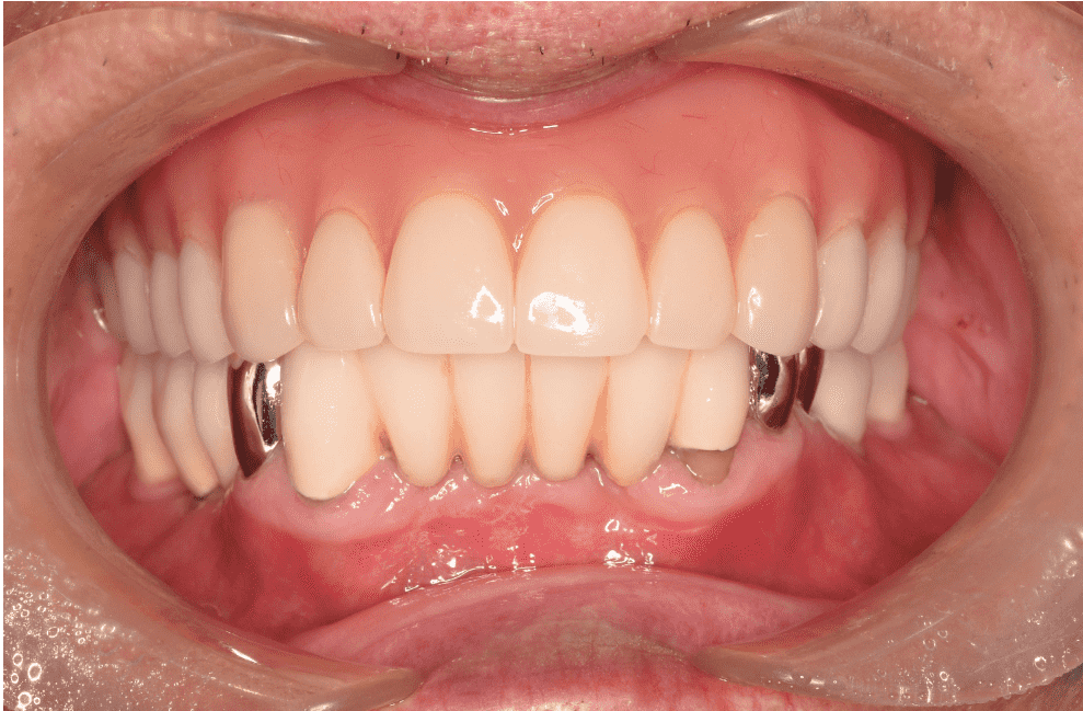 | 治療内容 | 下の歯周ポケットが深くなっている箇所に歯周外科処置を行い、下の前歯の根の治療をやり直してから、下の左右にインプラント手術を行いました。下顎のインプラントと骨の結合を待っている間に上顎に入れ歯のを支えるために必要な支柱4本を埋入し、上顎のインプラントと骨の結合を待っている間に、下の歯の被せ物の治療を行いました。その後、上の義歯の型どりを行いインプラントと義歯の接合部にケラターアタッチメントを装着することで義歯を安定させ、上下でしっかりと噛めるようにしました。 |